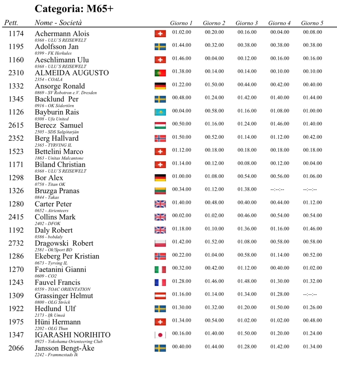 Les premiers départs des quatre premiers jours se font à 11 heures et le cinquième jour, le premier départ est à 10 heures. Il suffit de regarder les tableaux ci-dessous et d’ajouter 11 ou 10 pour connaître l’heure de départ de nos amis.